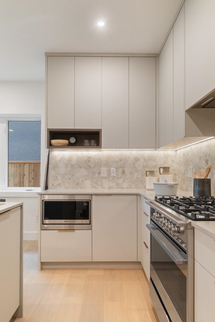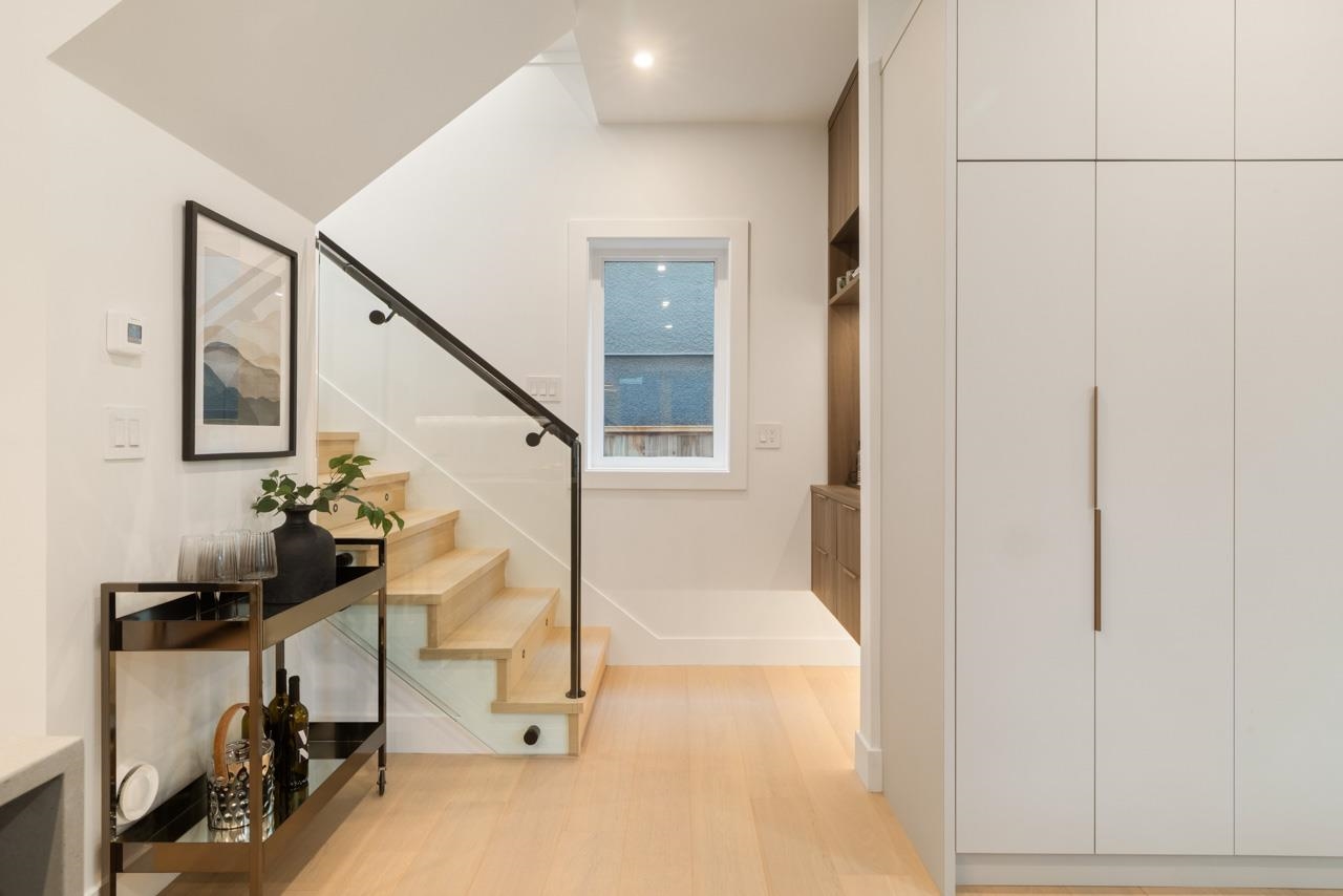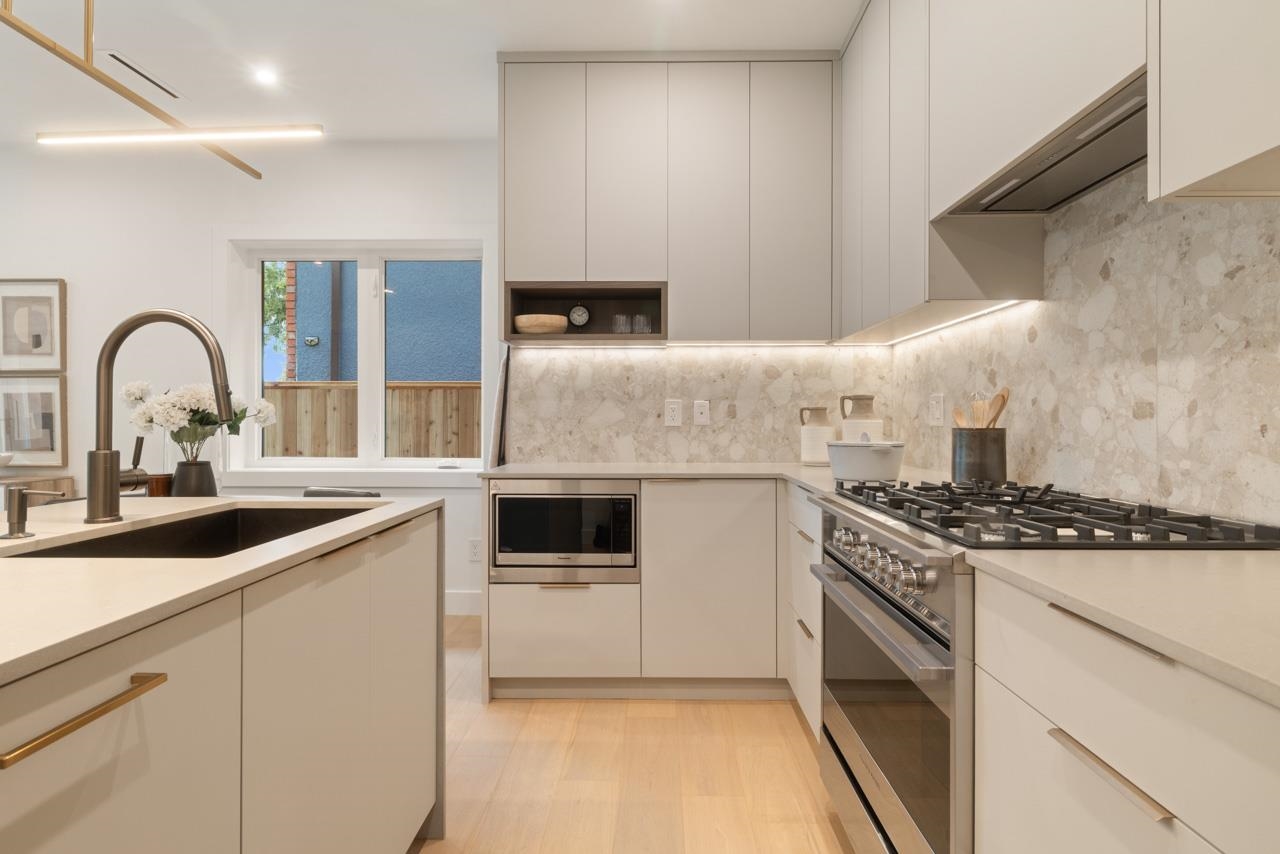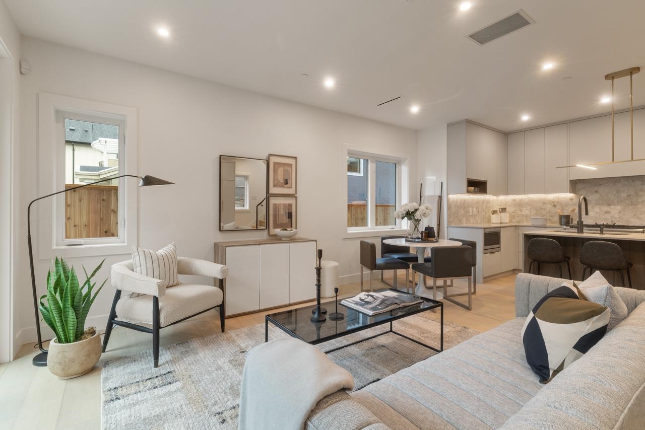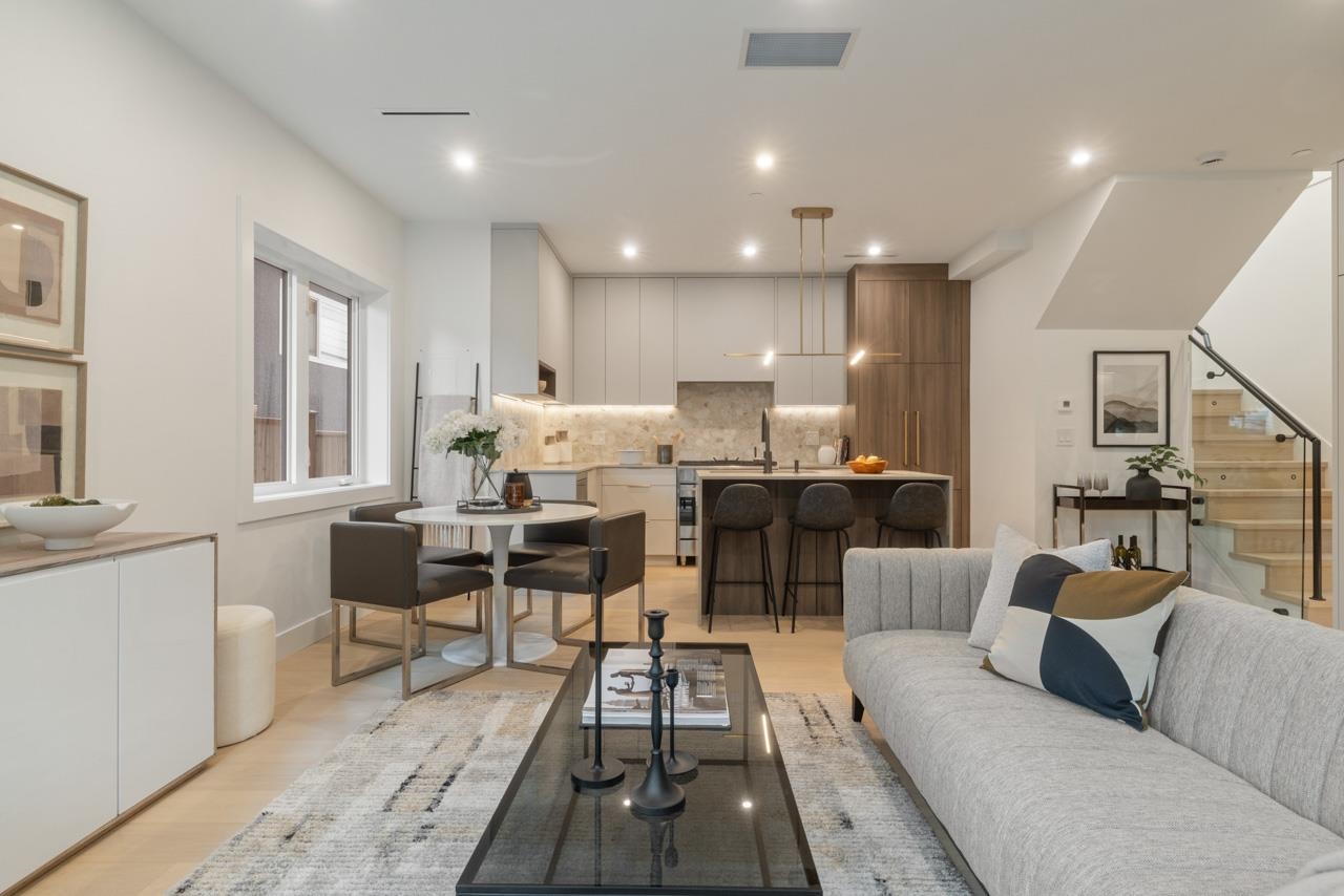 This exceptionally well built and beautifully finished front half duplex offers the perfect blend of style, comfort and function. The open main floor showcases a stunning kitchen with Fisher & Paykel integrated appliances, gas range and large island. Eclipse doors seamlessly connect the living space to a private patio and landscaped front yard. Upstairs features 3 bedrooms and 2 bathrooms, including a serene primary with ensuite. The top floor is a flexible retreat, ideal as a luxe primary suite with spa-like ensuite and covered balcony or perhaps a media room, or home office. Thoughtful details throughout like custom millwork & undersurface lighting. All in a popular East Van location close to schools, parks, and transit. Your opportunity to own Renfrew's nicest front duplex!