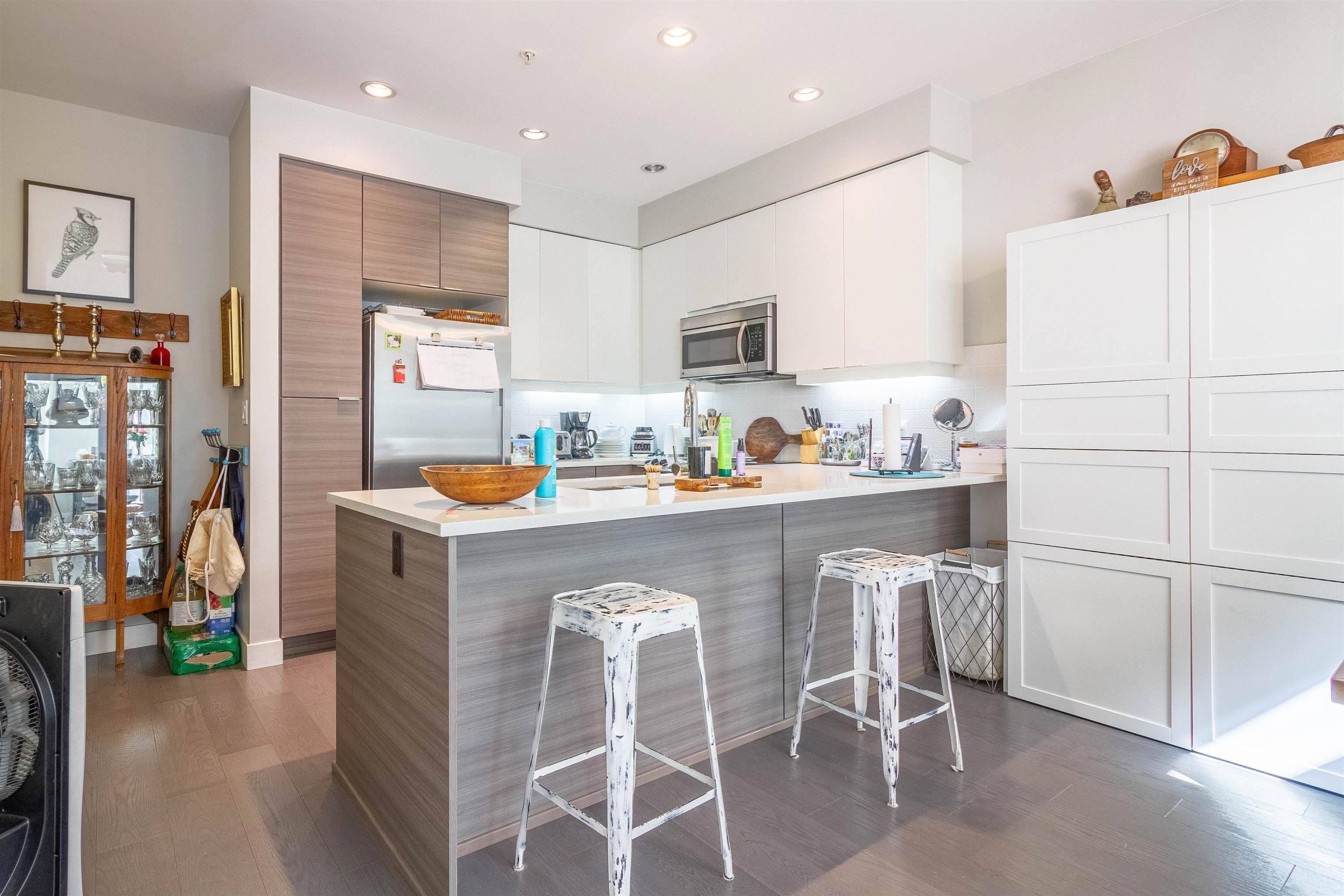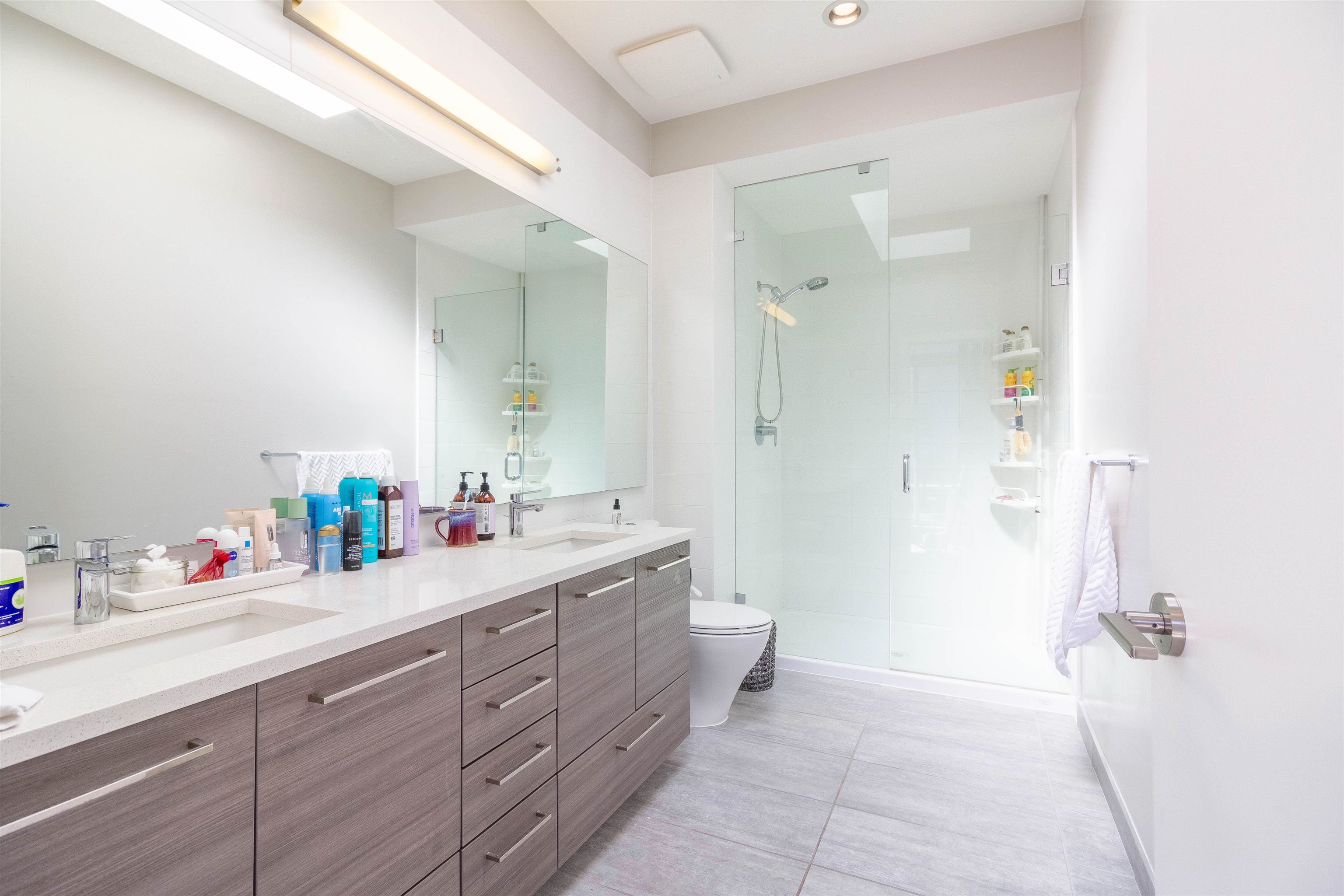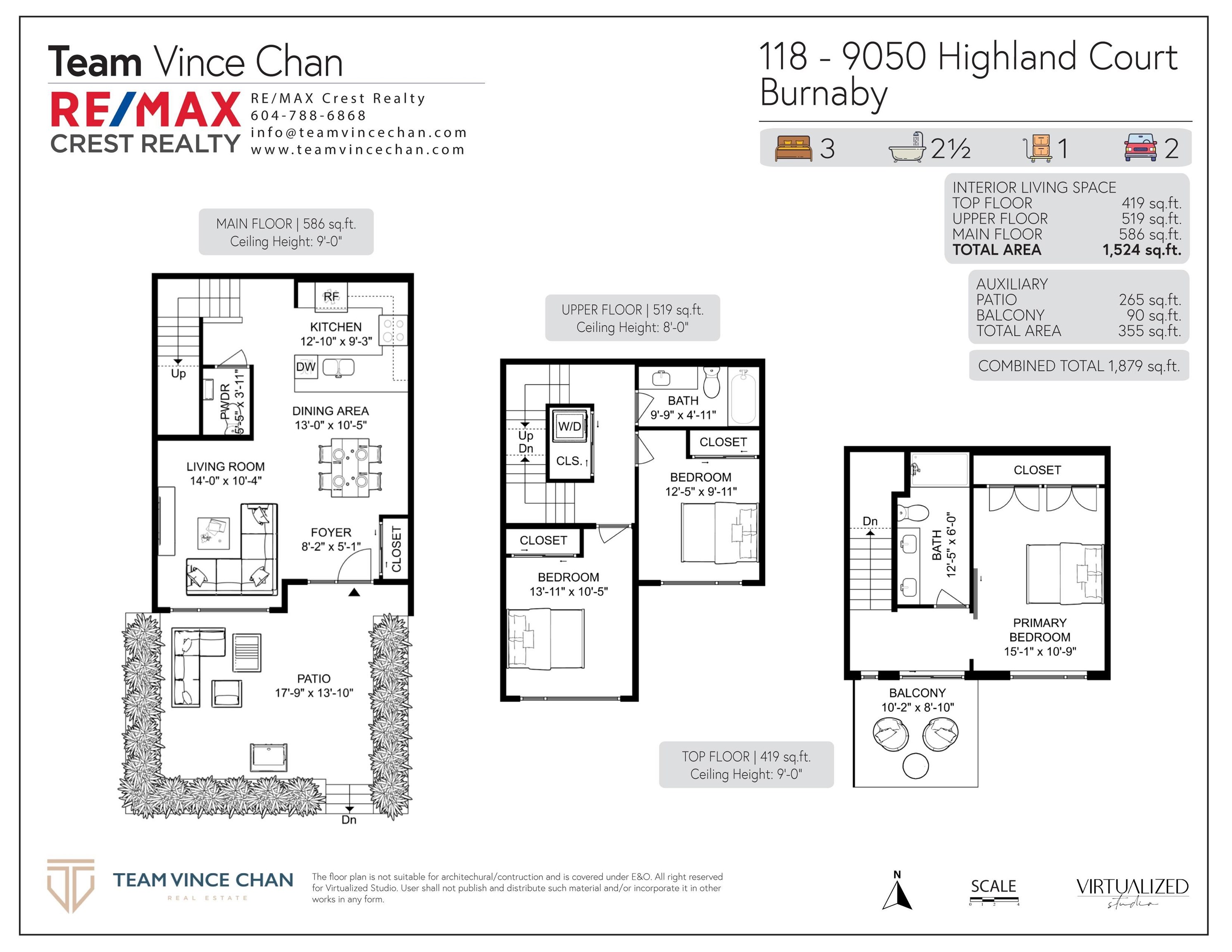 Experience urban living in CentreBlock at UniverCity! This central located 3-storey, 3 bed, 2.5 bath concrete townhouse offers ground-level access and great walk scores to groceries, restaurants and conveniences. Main floor feat. 9' ceiling and open layout in the living, dining and kitchen areas, creating a bright and airy space. Top floor is dedicated to the primary bedroom, offering privacy, complete with a spacious ensuite featuring a skylight, dual sinks, spa-like amenities and step out to your own personal balcony sundeck, perfect for relaxation. Step out to nearly 300 sf of patio from the living room, perfect for outdoor BBQ's and entertaining. Includes 2 parking and 1 locker. Simon Fraser University is a short walk away and University Highlands Elementary is across the street.