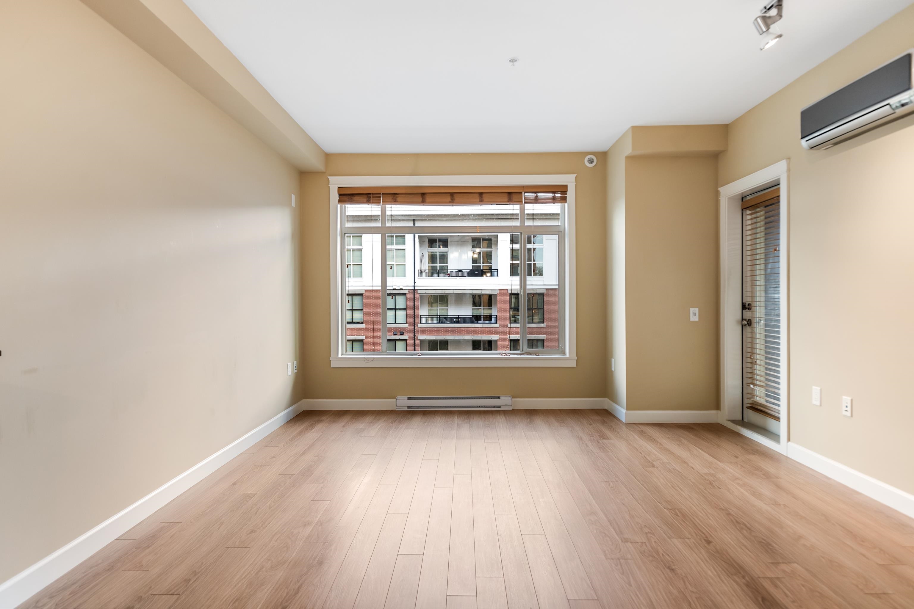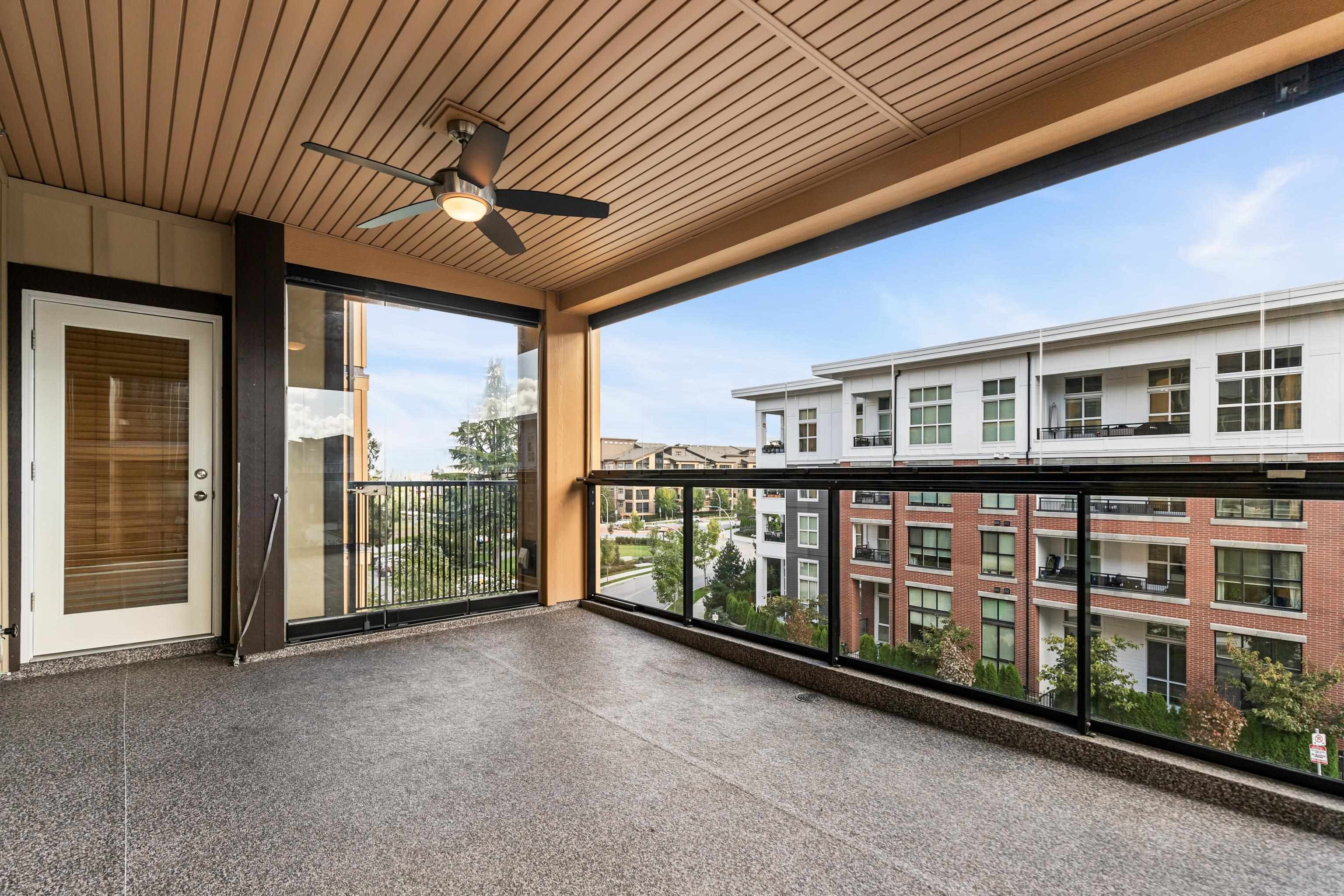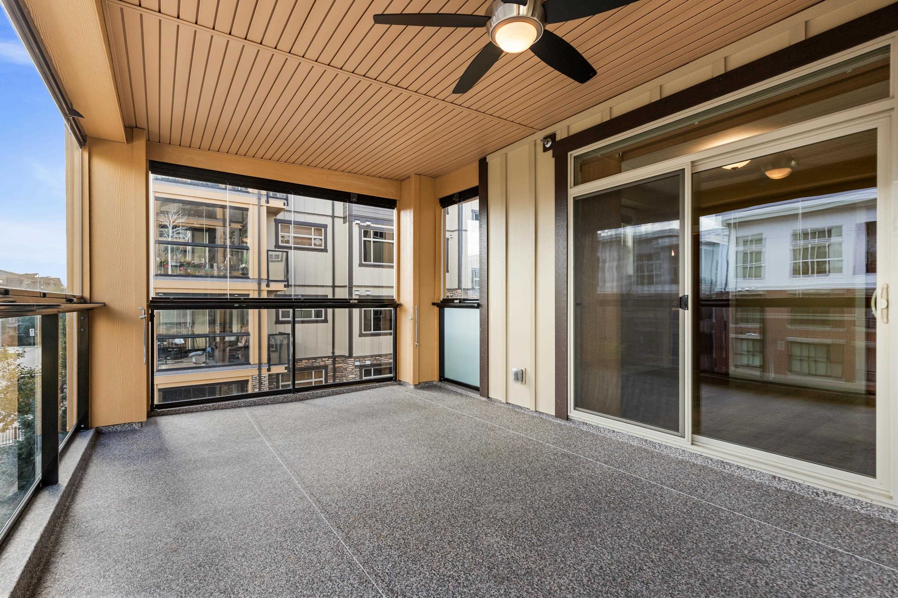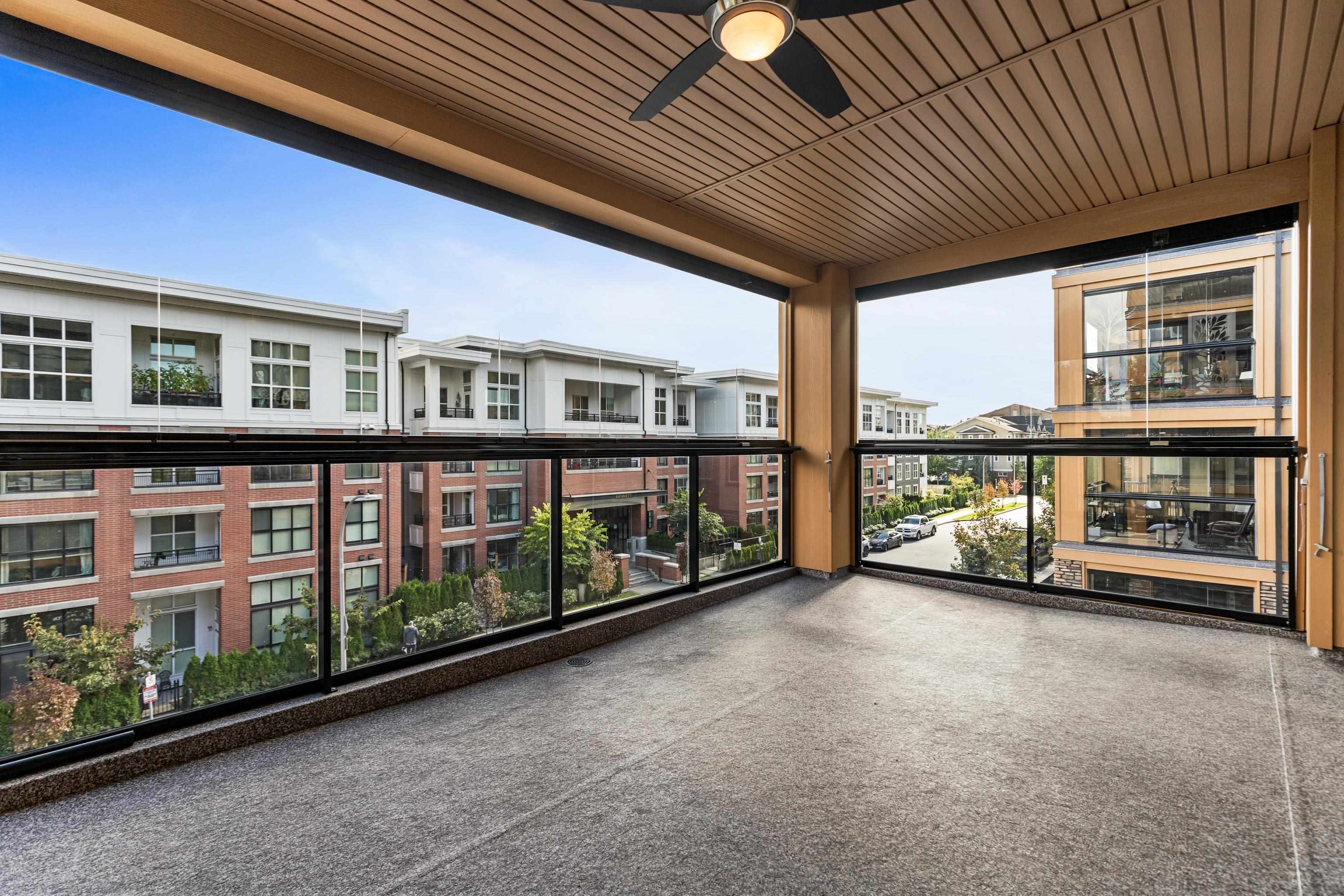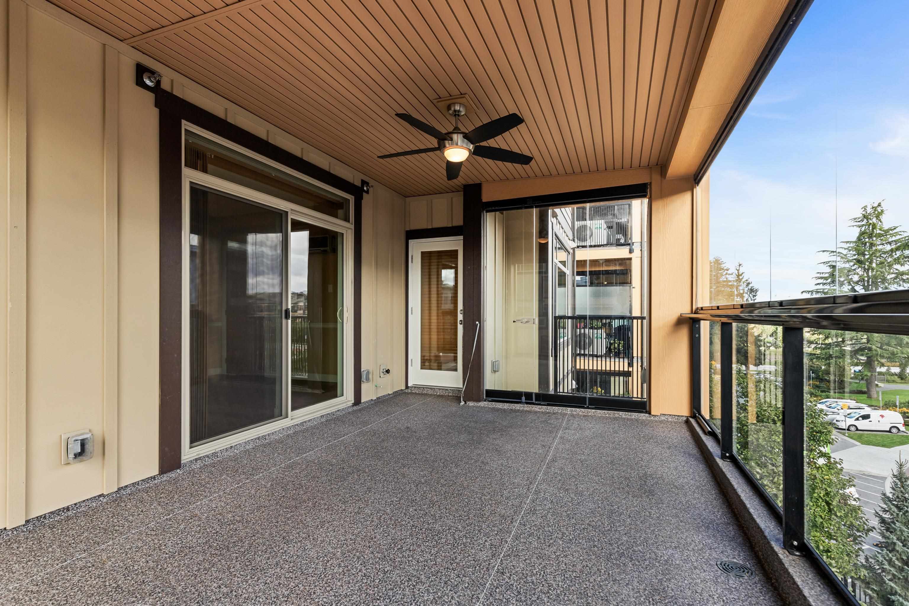 AMAZING CORNER UNIT 2 bed PLUS Den 1017 sqft condo with flexible 218 sqft fully enclosed solarium! Built by reputable developer Quadra Homes, this home boasts open concept floor plan with high end finishings and features including A/C throughout. Kitchen includes granite countertops, SS appliances, gas range with pot filler. Bathrooms outfitted with heated floors, anti-fog mirrors, granite countertops. Massive enclosed solarium off of living room usable during every season including gas bbq hook up! 2 parking with large roll up storage located in front one of the stalls. Conveniently situated in the heart of the desirable YORKSON community, walking distance to Willoughby Town Centre, Trails, Parks, transit, and much more! (note: some photos virtually staged)