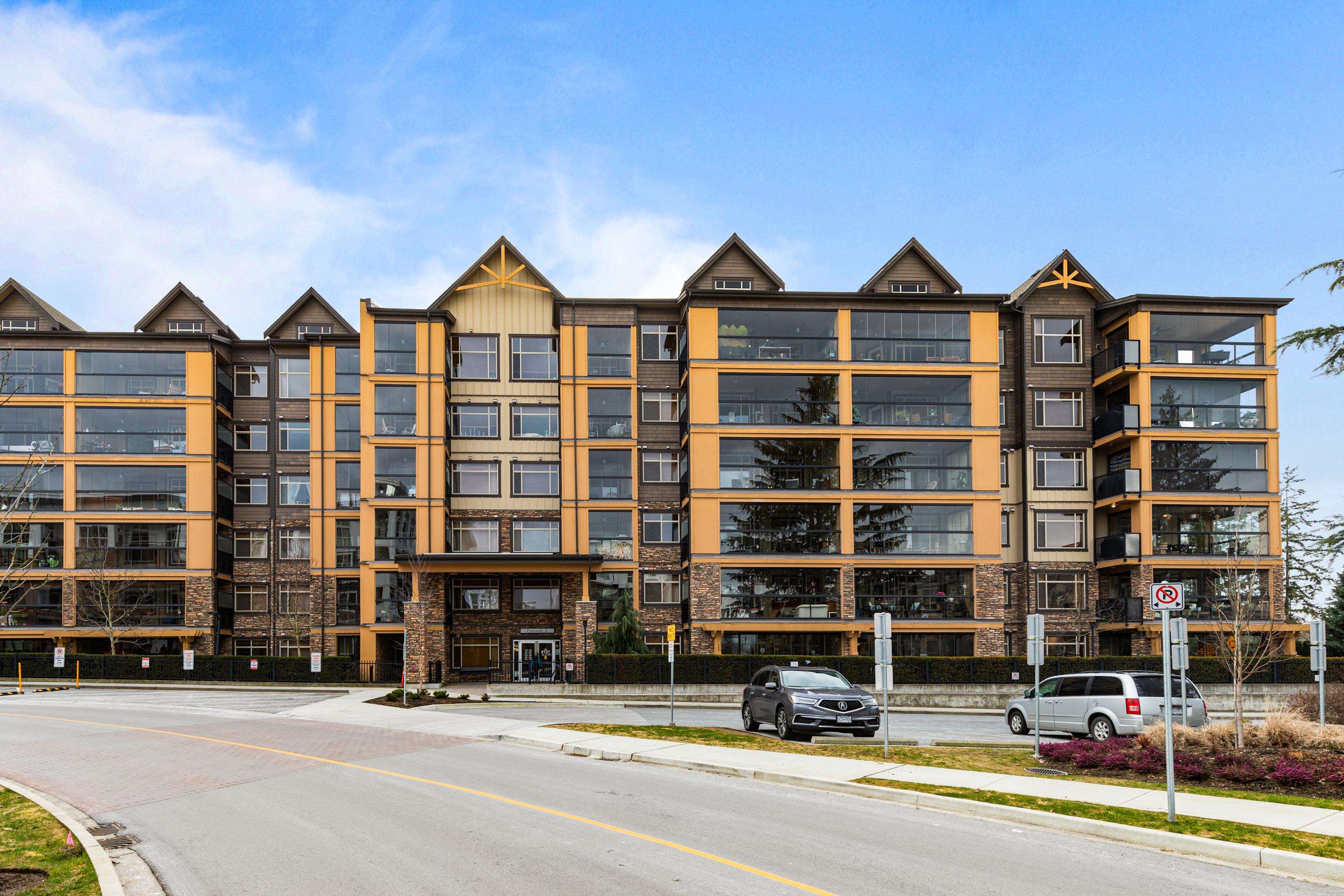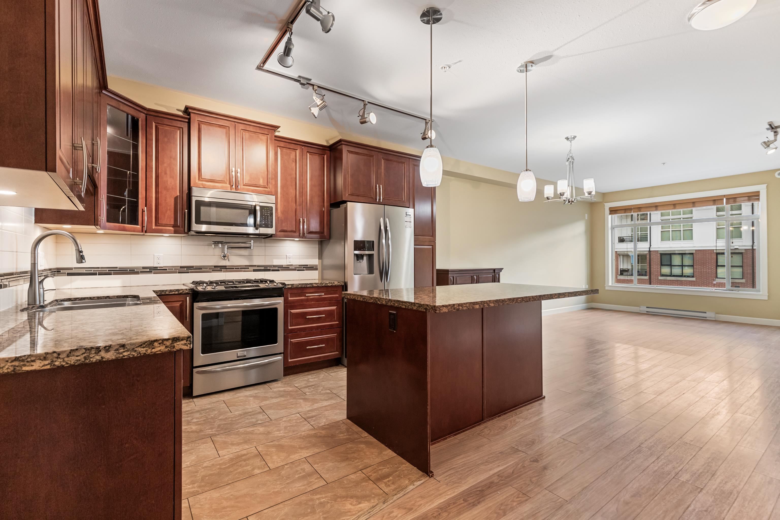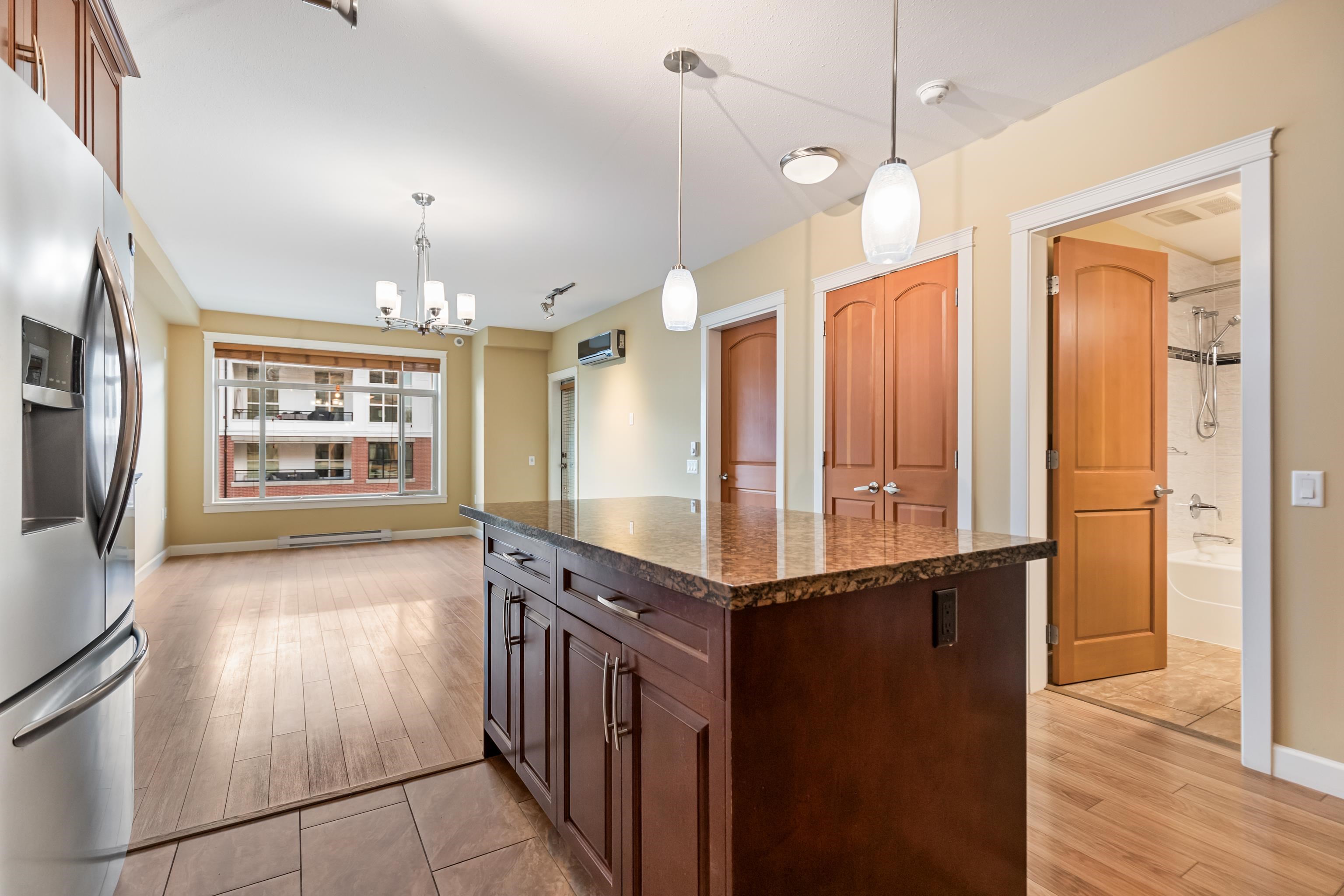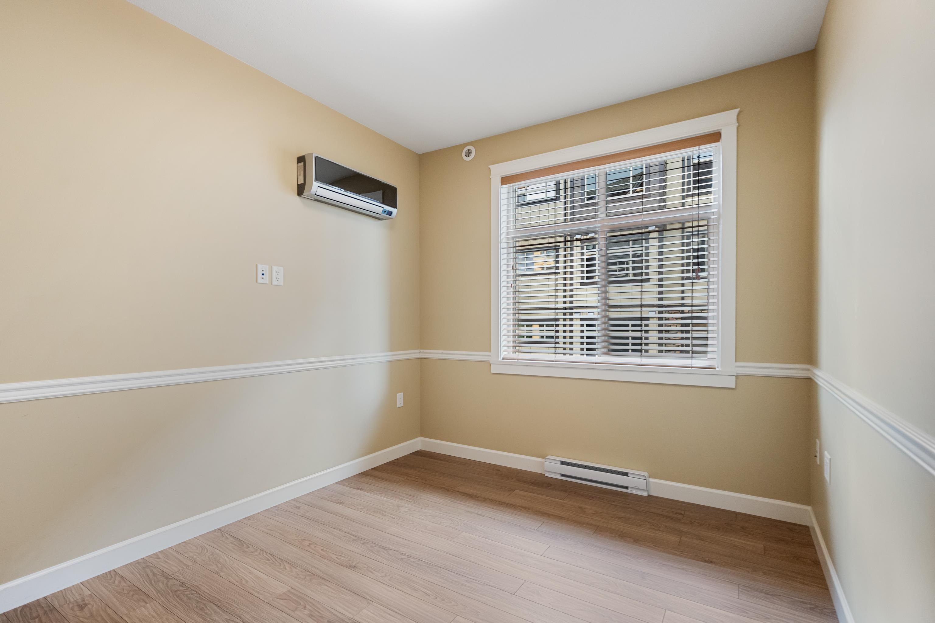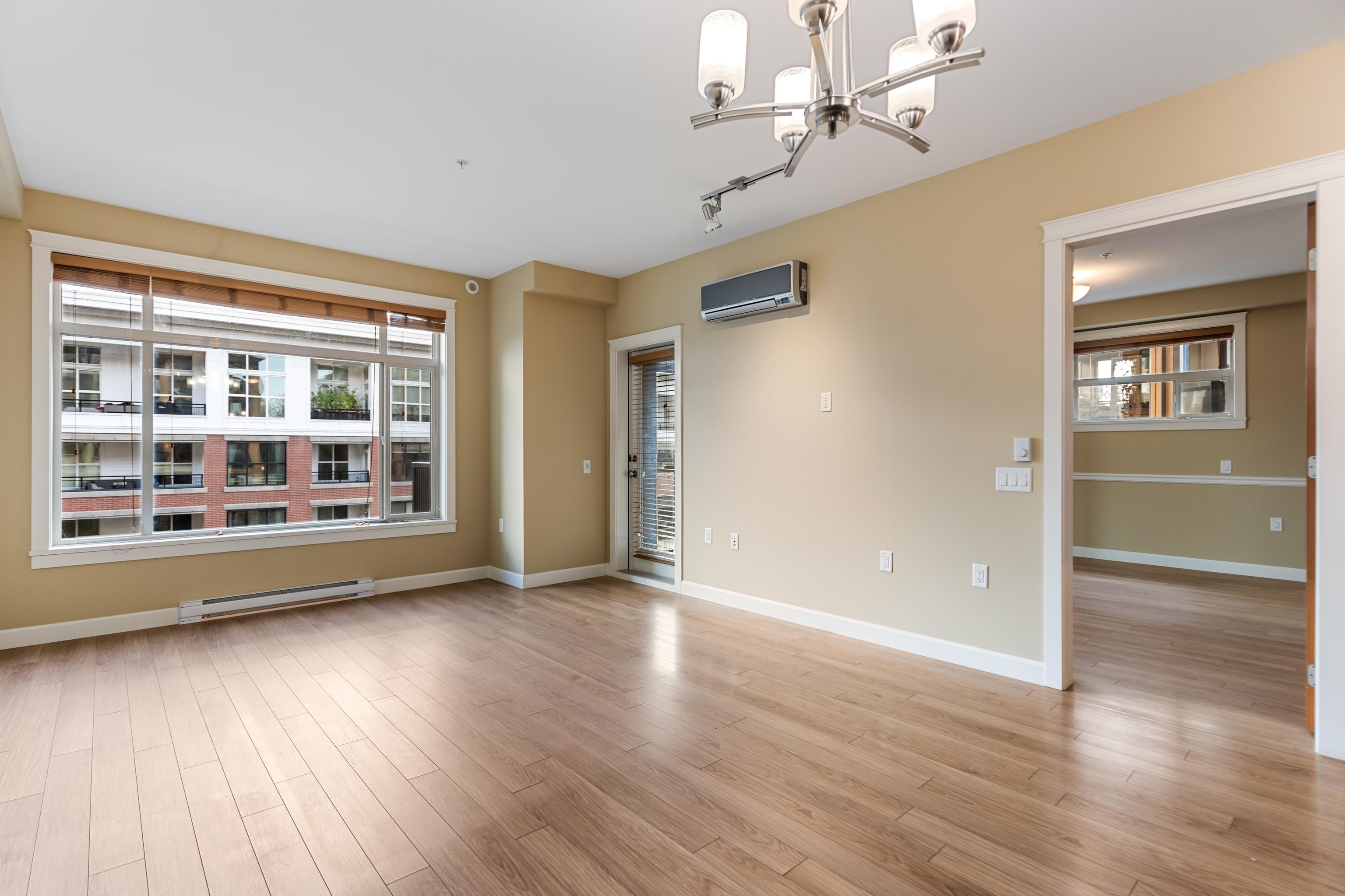 AMAZING CORNER UNIT 2 bed PLUS Den 1017 sqft condo with flexible 218 sqft fully enclosed solarium! Built by reputable developer Quadra Homes, this home boasts open concept floor plan with high end finishings and features including A/C throughout. Kitchen includes granite countertops, SS appliances, gas range with pot filler. Bathrooms outfitted with heated floors, anti-fog mirrors, granite countertops. Massive enclosed solarium off of living room usable during every season including gas bbq hook up! 2 parking with large roll up storage located in front one of the stalls. Conveniently situated in the heart of the desirable YORKSON community, walking distance to Willoughby Town Centre, Trails, Parks, transit, and much more! (note: some photos virtually staged)