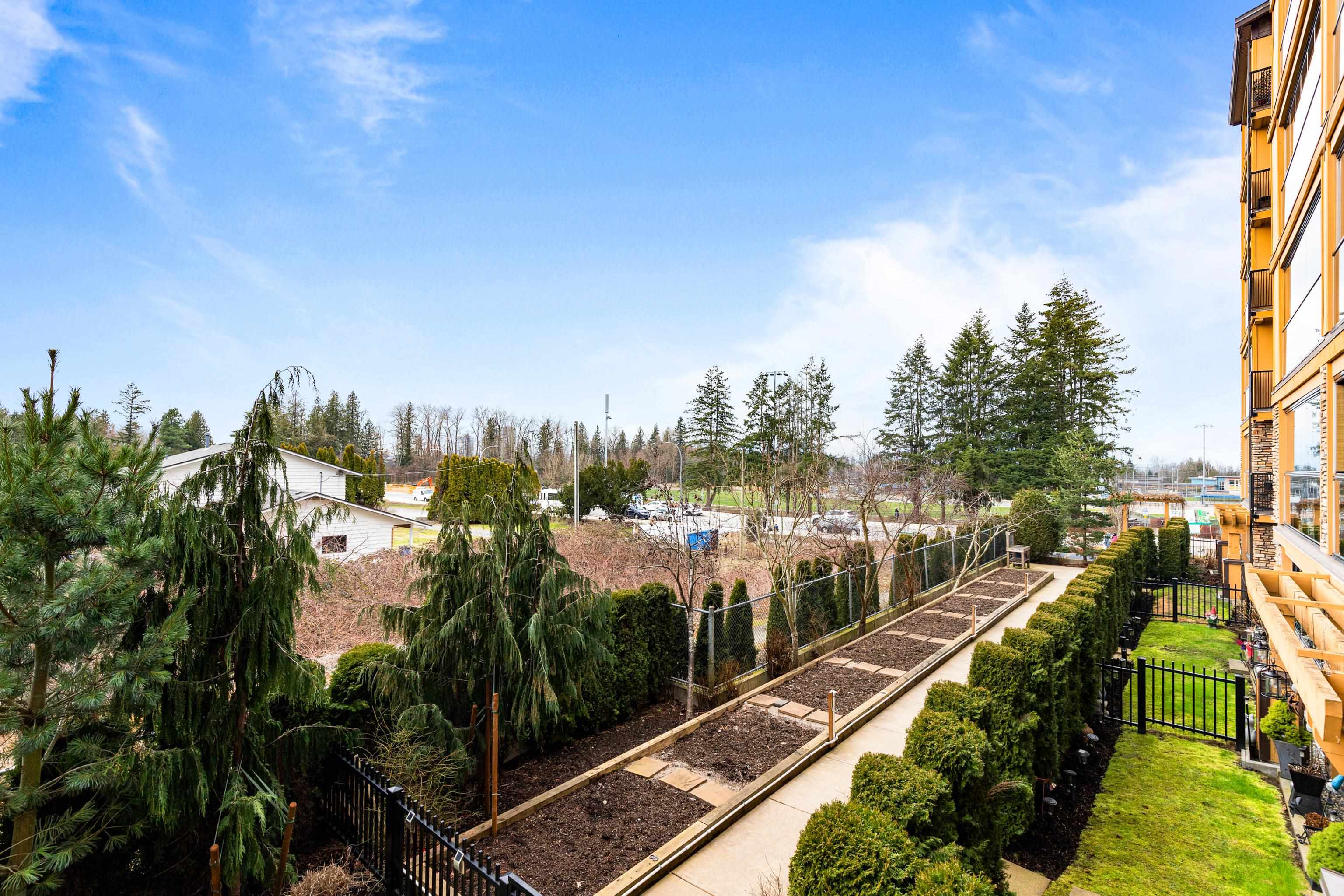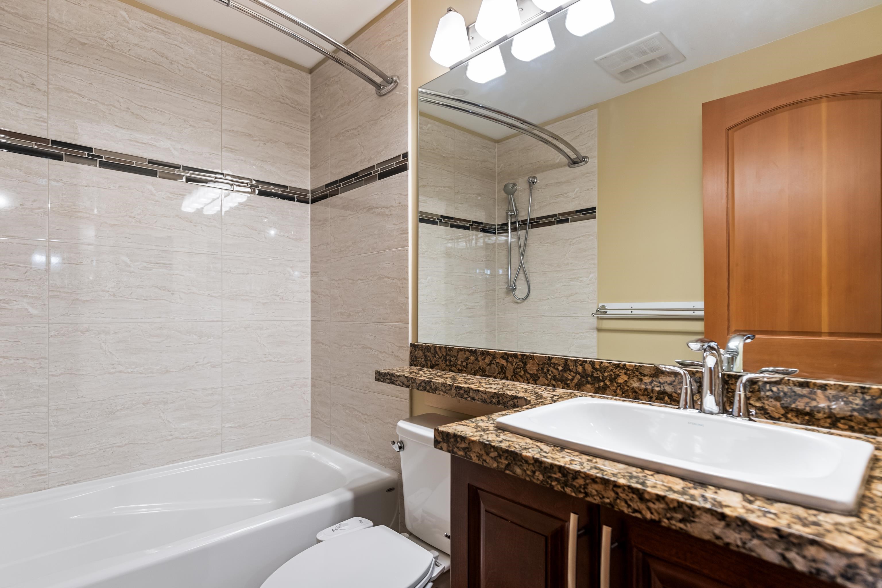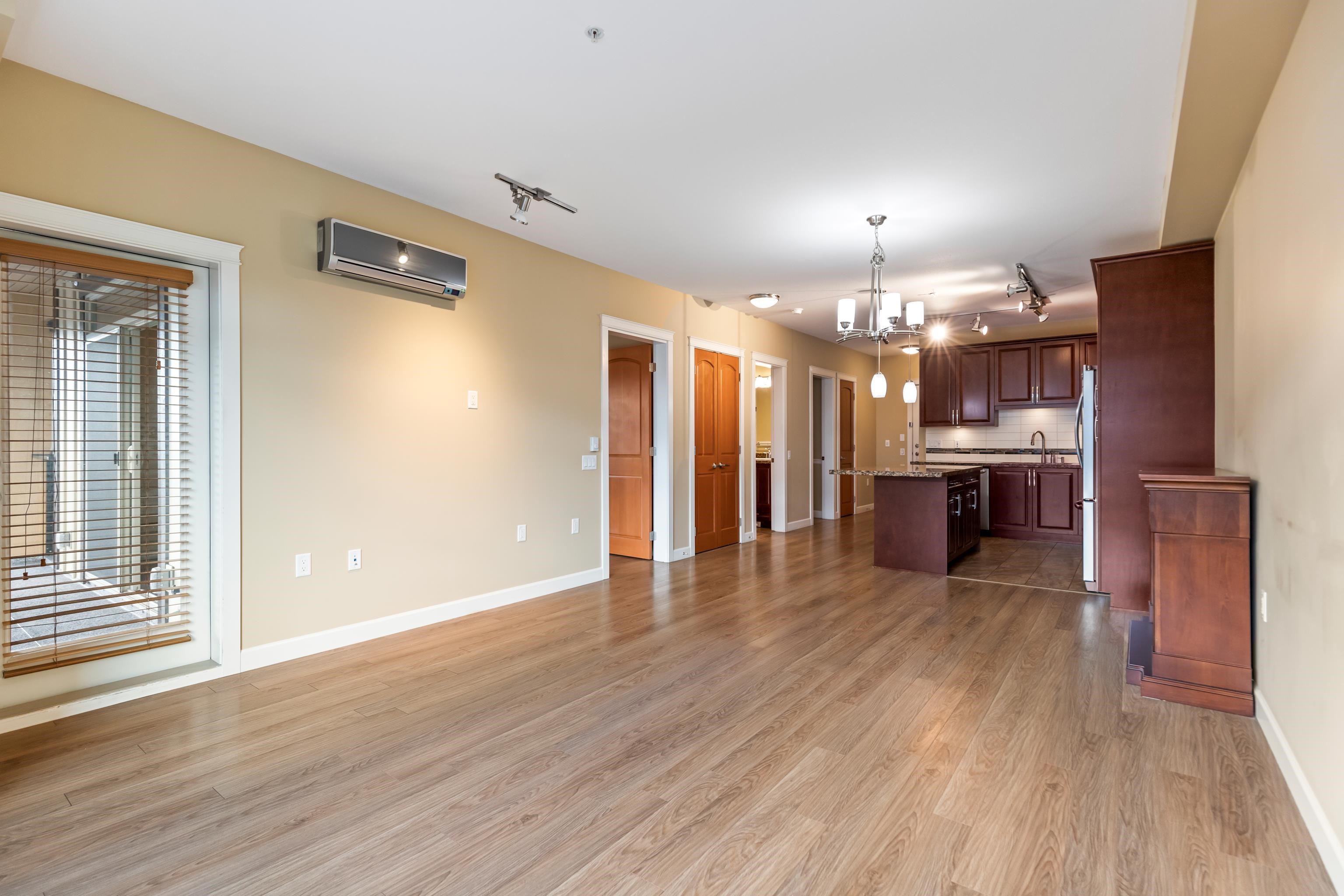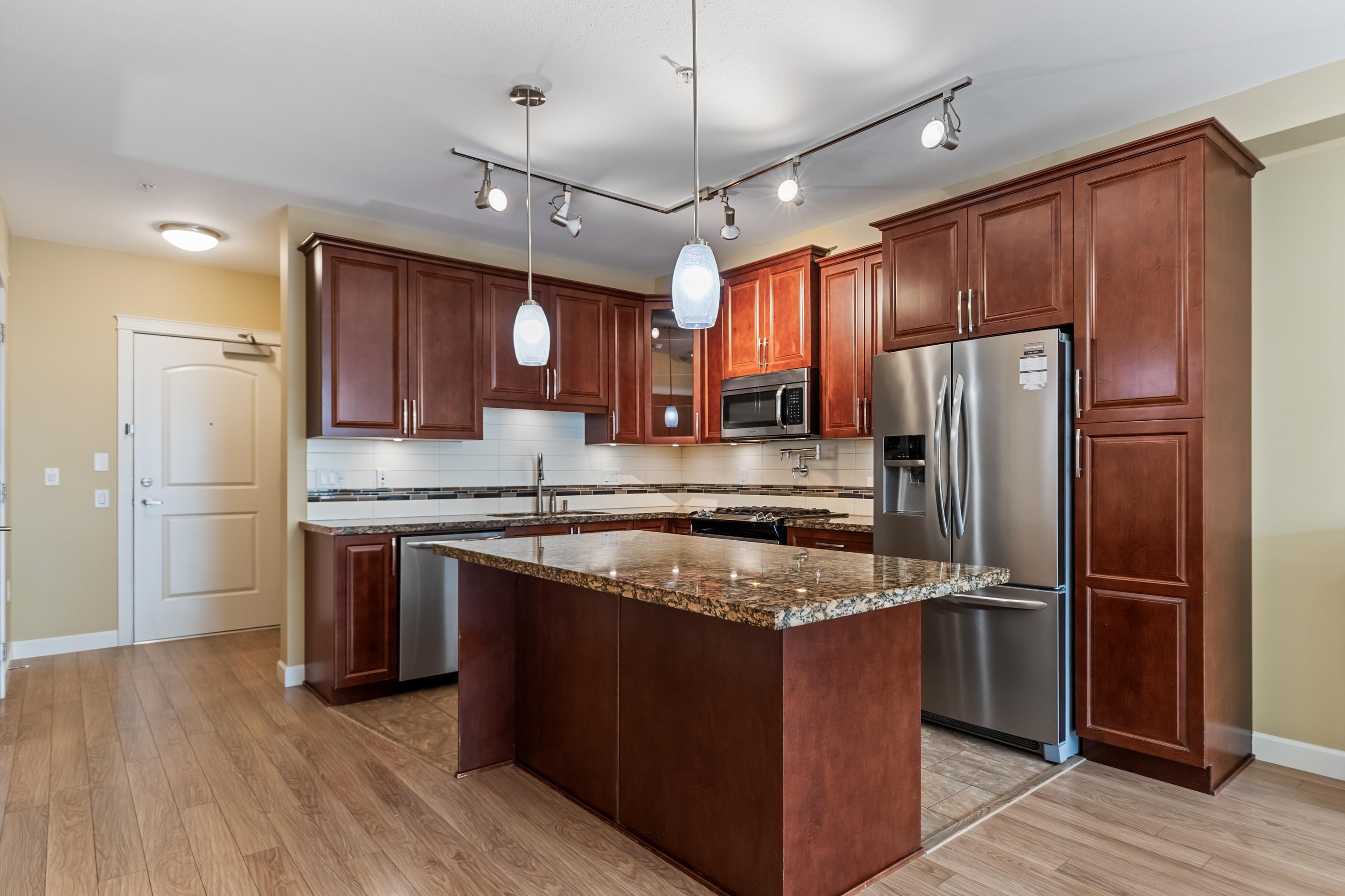 AMAZING CORNER UNIT 2 bed PLUS Den 1017 sqft condo with flexible 218 sqft fully enclosed solarium! Built by reputable developer Quadra Homes, this home boasts open concept floor plan with high end finishings and features including A/C throughout. Kitchen includes granite countertops, SS appliances, gas range with pot filler. Bathrooms outfitted with heated floors, anti-fog mirrors, granite countertops. Massive enclosed solarium off of living room usable during every season including gas bbq hook up! 2 parking with large roll up storage located in front one of the stalls. Conveniently situated in the heart of the desirable YORKSON community, walking distance to Willoughby Town Centre, Trails, Parks, transit, and much more! (note: some photos virtually staged)