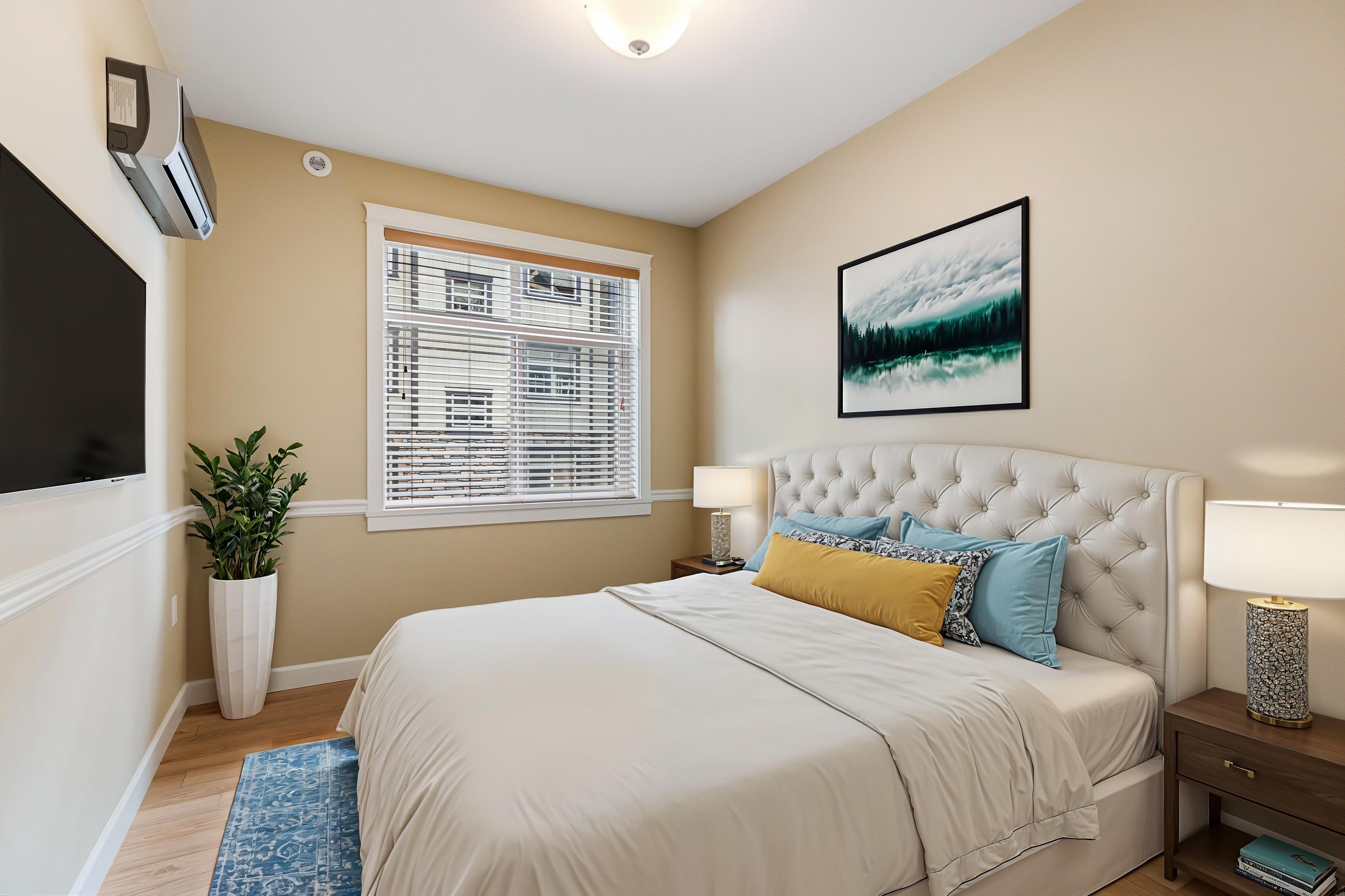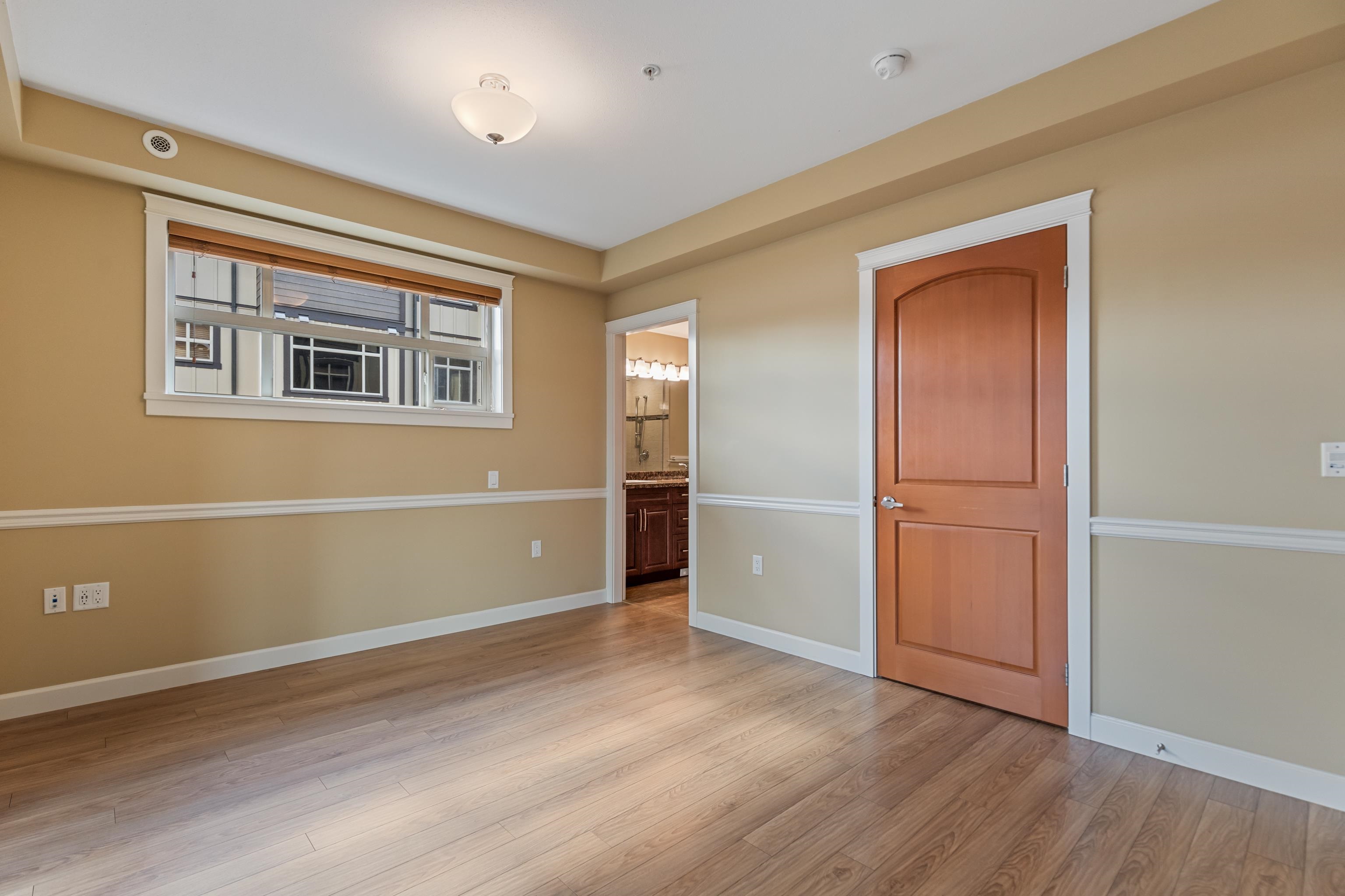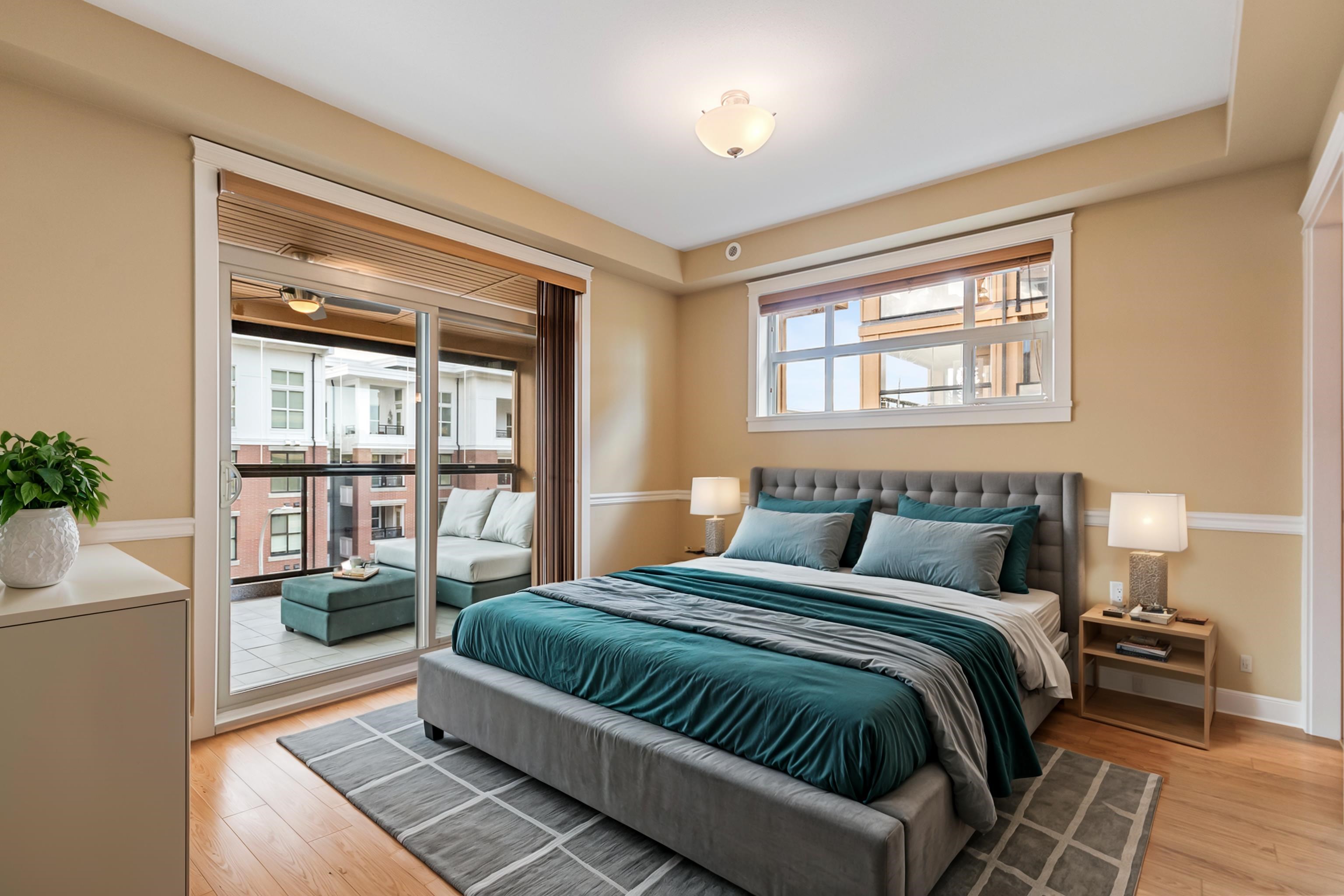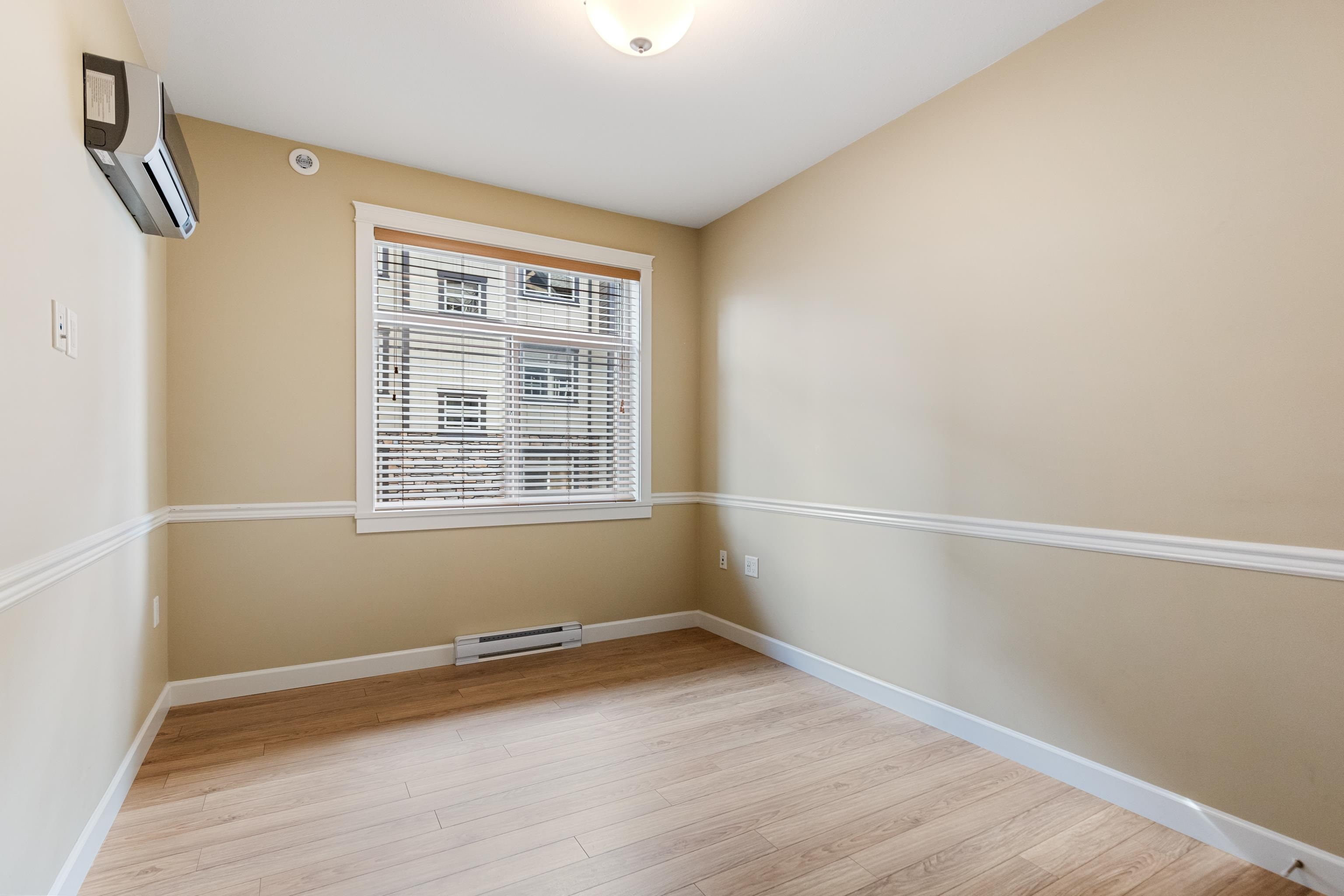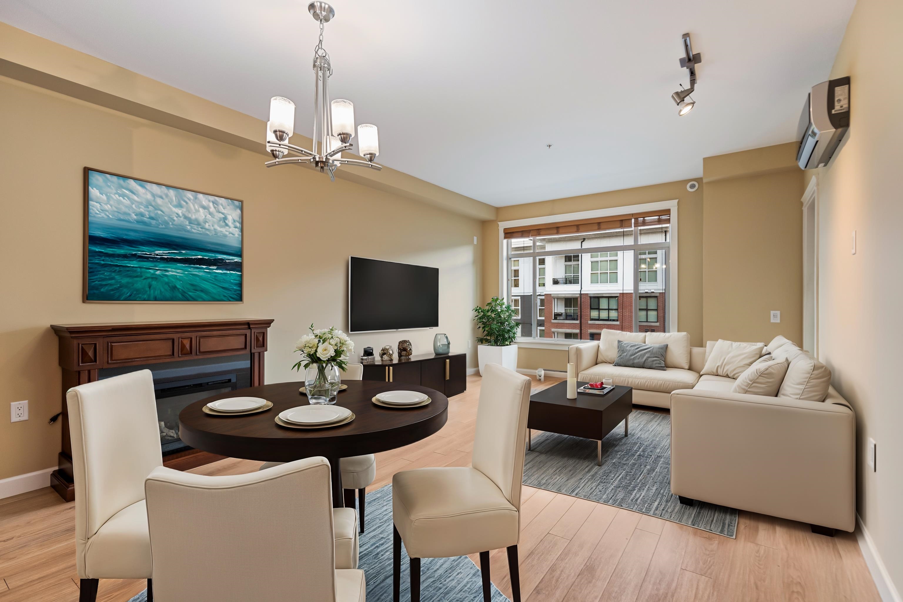 AMAZING CORNER UNIT 2 bed PLUS Den 1017 sqft condo with flexible 218 sqft fully enclosed solarium! Built by reputable developer Quadra Homes, this home boasts open concept floor plan with high end finishings and features including A/C throughout. Kitchen includes granite countertops, SS appliances, gas range with pot filler. Bathrooms outfitted with heated floors, anti-fog mirrors, granite countertops. Massive enclosed solarium off of living room usable during every season including gas bbq hook up! 2 parking with large roll up storage located in front one of the stalls. Conveniently situated in the heart of the desirable YORKSON community, walking distance to Willoughby Town Centre, Trails, Parks, transit, and much more! (note: some photos virtually staged)
